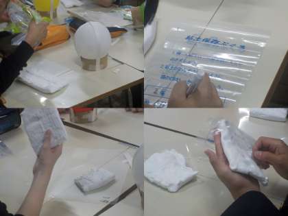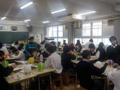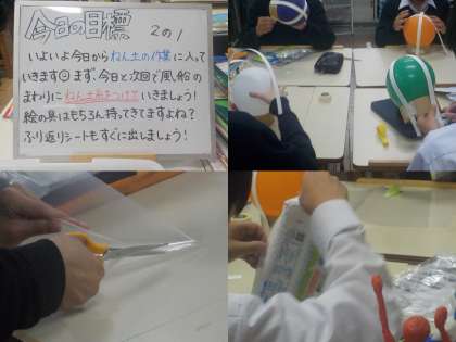 5月6日(木)に紹介しました「ランプシェードの作製」の続きです。前回は土台になるダンボールの上に風船を取りつけるところまで紹介しましたが、この時間は、風船の周りに色のついた細い粘土を取りつける作業です。順を追って説明します。