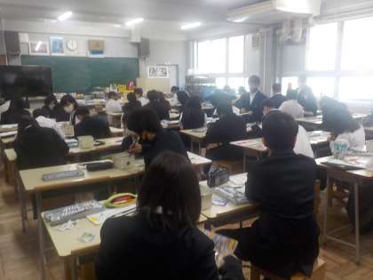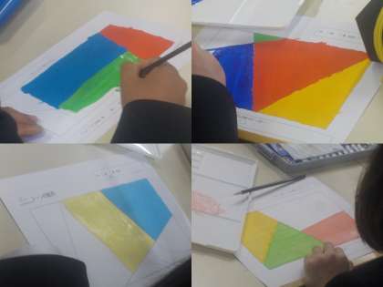 生徒の皆さんの作品を見ていて感じたことがありました。赤や青など、一色が目の前にある時と隣の色が変わる時では、印象がガラッと変わることがわかりました。同じ色でも隣にくる色によって、その色が引き立ったり、地味に感じることがあります。組み合せの大切さを実感しました。