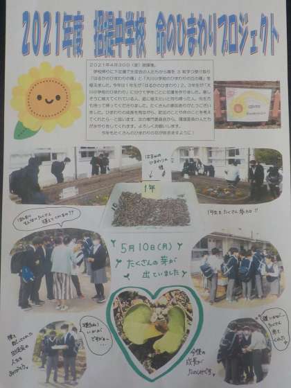 4月30日(金)に始まりました「ひまわりプロジェクト」のポスターが完成しました。各クラスに掲示することになります。種をまいた日の様子が映し出されています。招提中全体で見守りながら、大輪の花が咲く日を心待ちにしたいと思います。