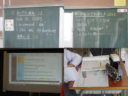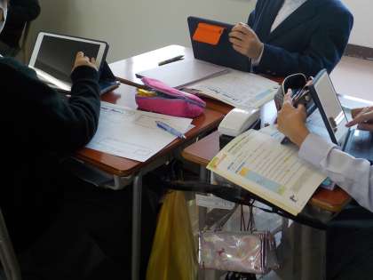 おすすめの曲のポイントをまとめて、あいさつを交えてスピーチをする取り組みです。教員が方法を説明してから、4人組での交流が始まりました。iPadで曲を調べたり、話し合いをしたりしながら、スピーチ文の作成が始まりました。
