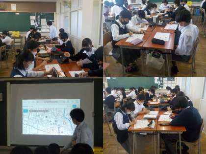 この時間は、私たちが住んでいる地域では、どのような自然災害が起きるのかを考えたり、自然災害の起きる原因などについて自分で考えたり、班やクラス全体で交流しました。