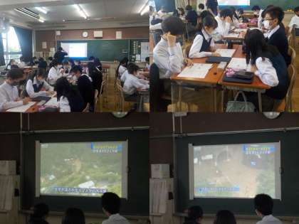 授業の最後には、動画(阪神淡路大震災、ハザードマップ、防災のニュースなど)を見て、現場の臨場感を体験しました。