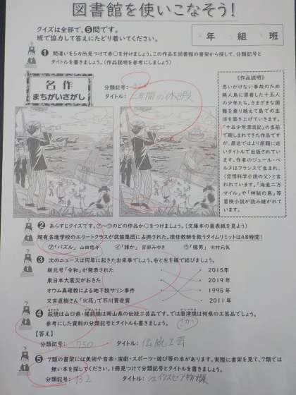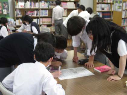 1〜3校時にクラスごとに学校図書館で「図書館を使いこなそう」をテーマに名作にまつわるクイズや本に係わる出来事や学校図書館の本の配置など、班ごとに本校の学校司書が作成した6種類のプリントを活用して、取り組みを行いました。