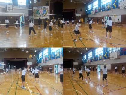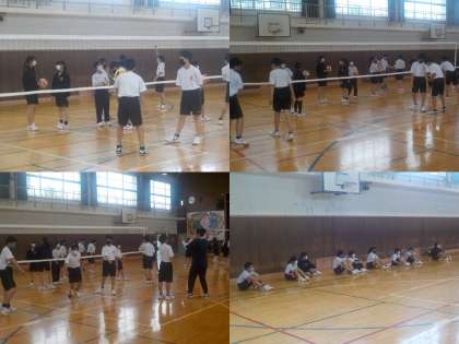 その後、2か所に分かれて、サーブの練習が始まりました。途中で教員から、「手打ちにならないように体重の移動が大切」「打ちたい方向に手や身体を向ける」の2点の指示が入りました。