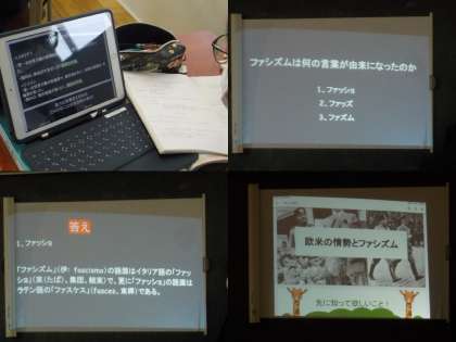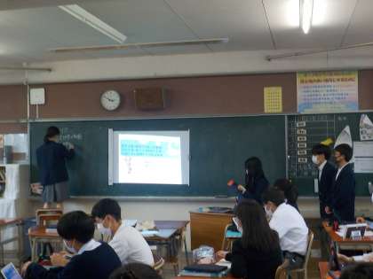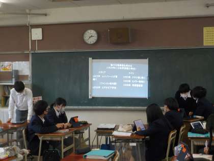 生徒の皆さんによるプレゼンテーションです。班で調べて、まとめたことを発表します。テーマを決めて、班で分担をして発表していきます。