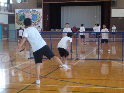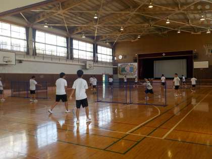 男子は体育館でのバドミントンの授業です。通常のバドミントンのネットより少し低い位置にネットが置かれているので、思い切ってスマッシュを打つことができます。