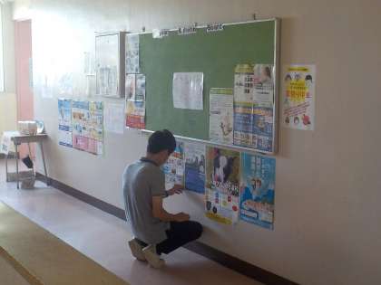 進路指導主事の教員が低い位置にポスターを貼っています。一人ひとりの進路の希望がかなうことを願っています。