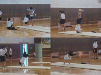 倒立前転や後転倒立など、倒立と前転、後転など組み合せた技にチャレンジです。