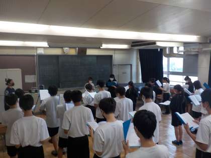 音楽室での合唱の練習です。まずは、しっかりと歌詞を憶えて自信をもって声を出すことです。
