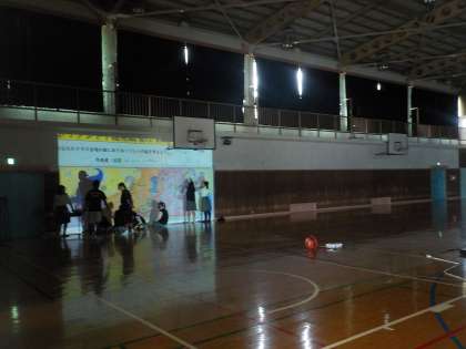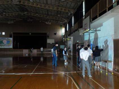 体育館の壁にホリゾントの用紙を貼り付けて、そこに映像を映します。