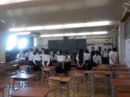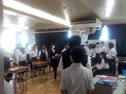教員が生徒の輪の中に入ってアドバイスをしています。