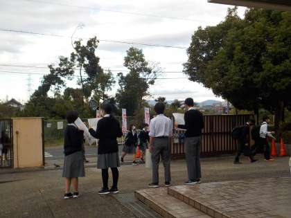 登校してきた生徒に積極的に声をかける立候補者の姿が見られました。