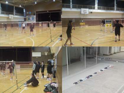写真は、女子バドミントン部の練習風景です。体育館前にきちんと靴をそろえて、段取りよく練習が進められていました。