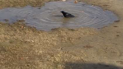 1月13日(木)カラスの行水? 公開日 2022/01/13 更新日 2022/01/13 学校の様子 中庭の水たまりの中で行水?をするカラスを見つけました。 この寒さの中でも水の中に入っていることに驚きました。 授業終了のチャイムとともに飛び立ち、体育館の手すりまで移動しました。 自然や生き物などを見ていると、ホッと心が和む時があります。 生活の中にもホッと気を緩める時間を持ちたいものです。 いいね(0)