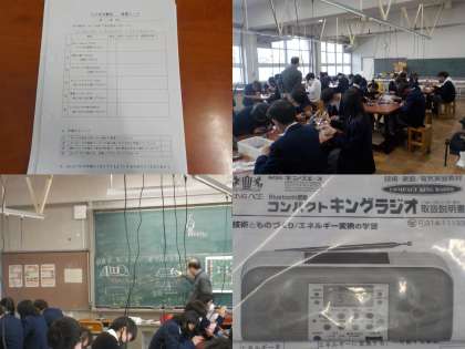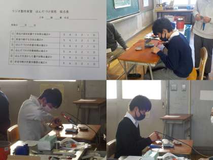 1月14日(金)6校時 2年1組 技術・家庭科 公開日 2022/01/14 更新日 2022/01/14 学校の様子 ラジオの作製です。 いろんな工程を通して、ラジオが完成されます。 はんだ付けの作業は、集中力が要求されます。生徒の皆さんは、ていねいに細かいところにも気をつけて取り組んでいます。(写真中) また、はんだ付けの実技テストも行われました。いろんな項目で評価されます。教員の目の前で、少し緊張しながらも、着実に課題に向き合う姿が見られました。(写真下) いいね(0)