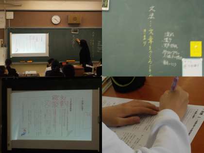教員は、黒板に投影したプリントに手書きの説明を加え、生徒の皆さんは、直接プリントに記入しています。