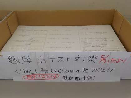 教室棟4階の2年生の教室前の廊下に数学の学習課題が置かれています。