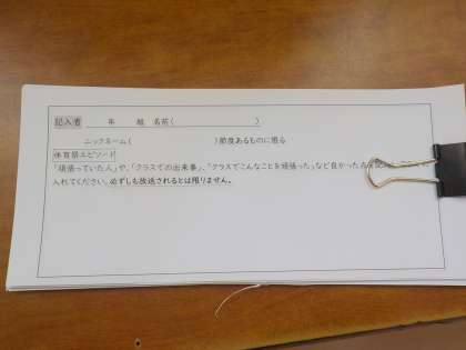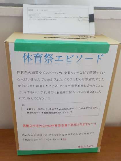 6月7日(火)に実施予定の体育祭の取り組みについてのクラスのエピソードなどを書いて箱の中に入れます。