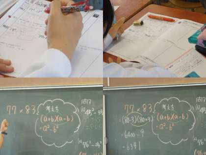 77×83を(80-3)(80+3)=6400-9にすることで、計算がシンプルになります。