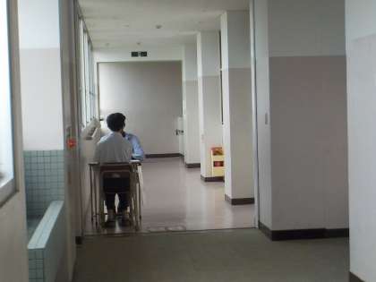 教室前の廊下でNET(英語教育指導助手)の教員と生徒が一対一のやり取りを行っています。