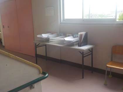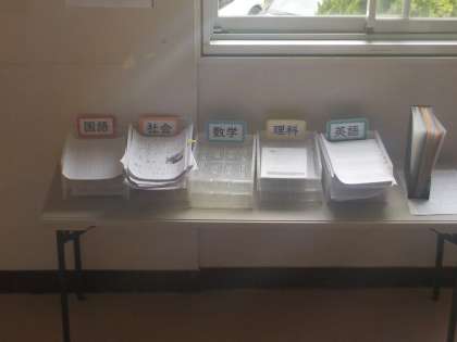 3年生の教室前の廊下に学習課題のプリントなどが置かれています。