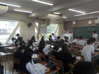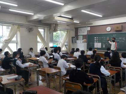 左の写真は、2年3組です。教員からテストの説明を受けています。
