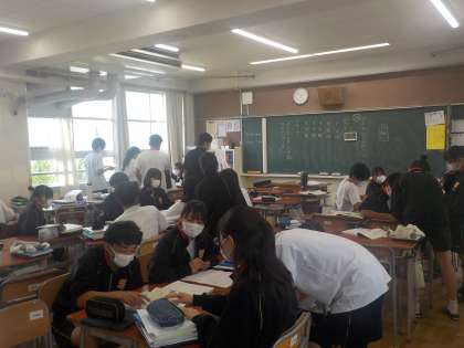 教室内を動いて情報収集したり、班で話し合ったり、活発な動きが見られます。