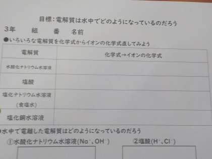 「電解質は水中でどのようになっているのだろう」が授業の目標です。