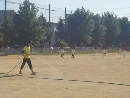 グランドに水をまく教員の様子です。
