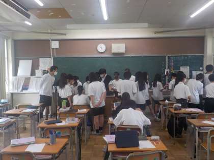 いくつかのサンプルも用意されているので、教卓の前に集まって見ています。(写真中)