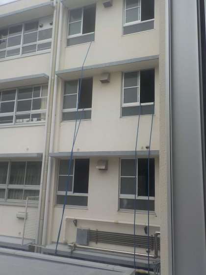 教室棟のトイレの窓から、外にホースが出ています。