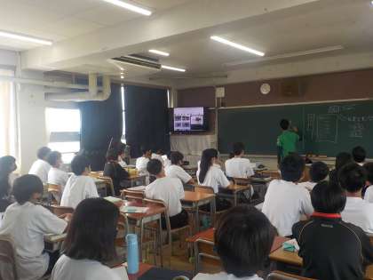 教室の前面に新しく設置された大型テレビも活用し、画像を交えて説明が行われています。