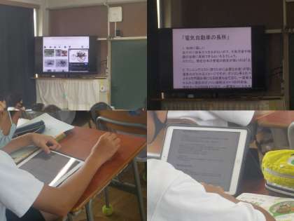 環境や地球温暖化などの内容にも触れ、今開発されている電気自動車についても学びを深めています。