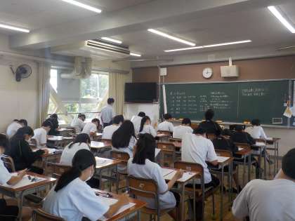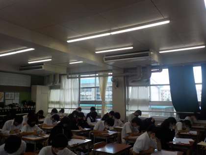 8月31日(水)3年生 実力テスト 公開日 2022/08/31 更新日 2022/08/31 学校の様子 今日は、3年生を対象に国語、社会、数学、理科、英語の5教科の実力テストが行われます。 生徒の皆さんの現状の実力を把握するための重要なテストです。 定期テストのようにテスト範囲というものはなく、今までの地道な取組みの成果が問われます。 担任の教員から説明を受けて、真剣な表情で取り組む姿が見られました。 ※写真は、左から1組、2組、3組です。 いいね(0)