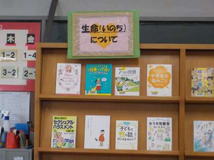 先ほど紹介しました保健室前の掲示物「自分を相手を大切にしよう」に関連した本の紹介が行われています。