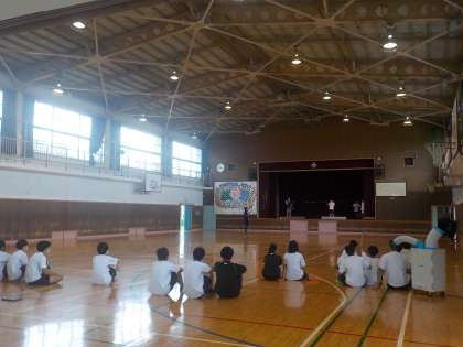 写真は、3年1組の劇の練習です。ステージ上の生徒とステージ下の生徒に分かれて、動きなどを確認しています。