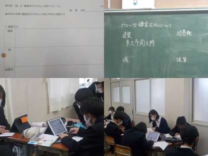 建築、絵巻物、像、随筆の4つのテーマについて、班ごとに調べ学習が行われています。