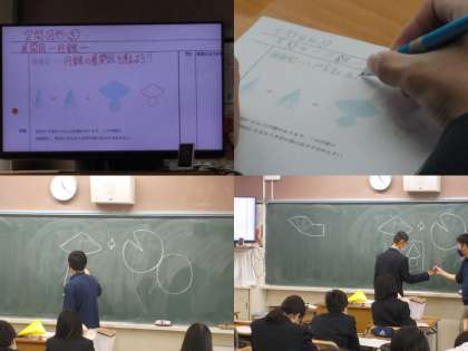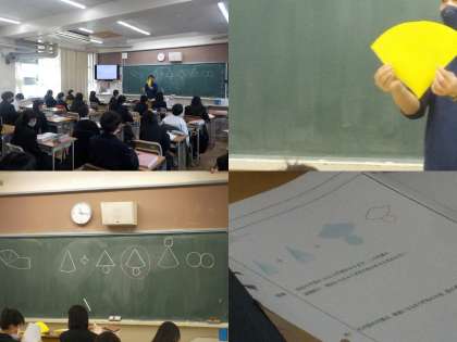 イメージしやすいように、教員が黄色い画用紙を活用して、平面から立体への変化を説明したり、生徒の皆さんに黒板に記入させるなど、随所に工夫が見られます。