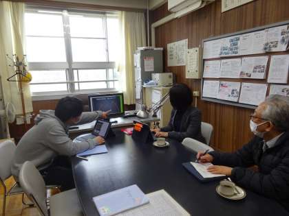 校長室にて担当教諭から招提中学校の取組の説明をし、