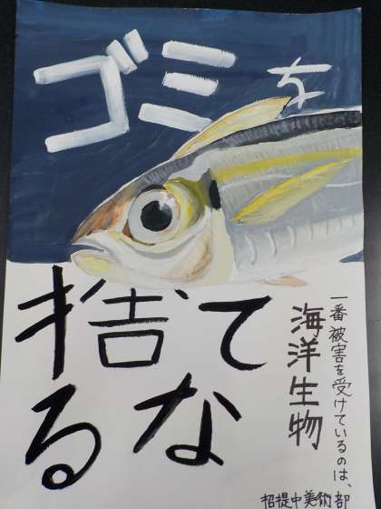 6月7日(水)美術部の取り組み 公開日 2023/06/07 更新日 2023/06/07 学校の様子 迫力のある魚が描かれています。美術部の生徒がゴミの廃棄についての啓発ポスターを作ってくれました。 また、美術部では、生徒の皆さんが作ってほしいポスターやイラストなども募集しています。 職員室の前に募集用のコーナーが設置されています。 たくさんの掲示物が校内に広がっていくことを期待しています。 いいね(0)
