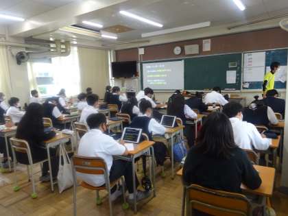 社会の授業ではタブレットを使った調べ学習(世界の宗教)が行われていました。