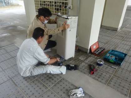 学校校務員の方と事務の方が、生徒の皆さんに安心して飲んでもらうため、ウォータークーラーのメンテナンスをしていました。