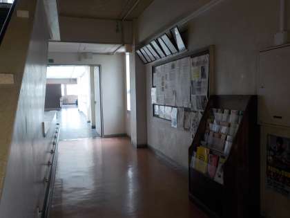 管理棟2階から渡り廊下に行くところにある木製のラックです。