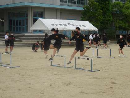 2年生の体育では男子が走り幅跳び、女子がハードルを練習していました。