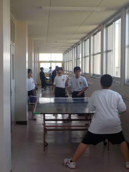 練習では教室内だけでなく、廊下にも卓球台を設置して熱心に取り組んでいます。