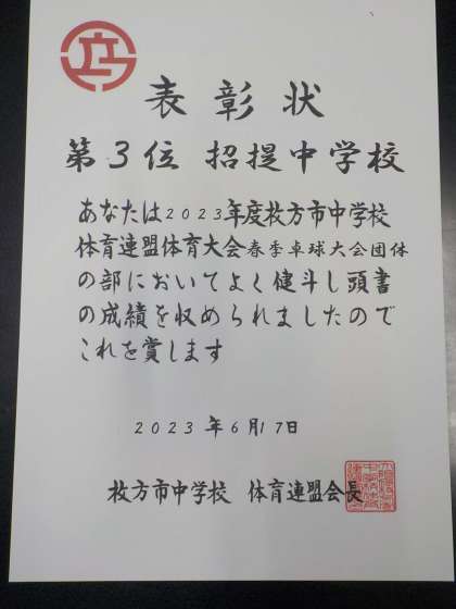 卓球部が枚方大会の団体戦で、みごと第3位になりました。