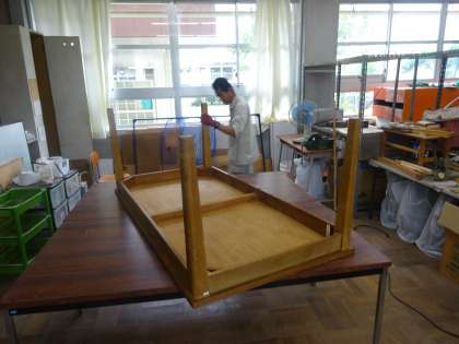現在、学校校務員の方に図書室の机をメンテナンスしてもらっています。