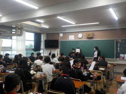 2年3組の教室では、図書委員から学校図書館の取り組みについての説明が行われています。