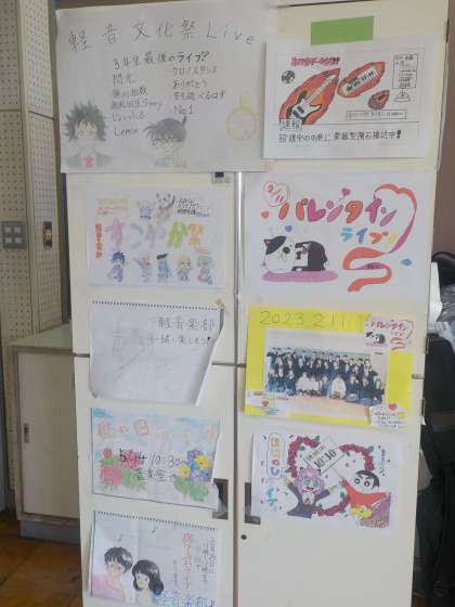 音楽室内には、今までのコンサートのポスターもたくさん掲示されており、それぞれテーマを決めて取り組んでいることがわかります。