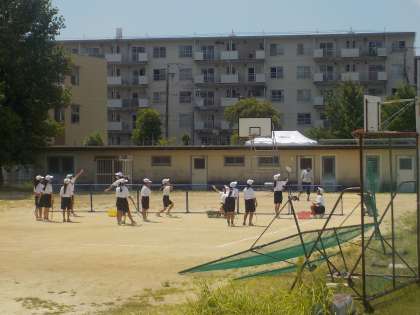 女子ソフトテニス部の練習は、校門付近(写真下)とプール前(写真上中)の二か所に分かれて行われています。